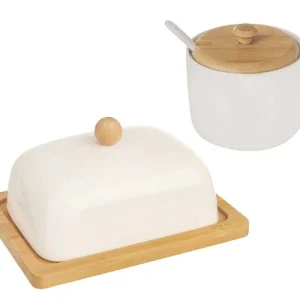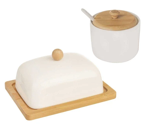 Cukierniczka i Maselniczka to elegancki zestaw porcelanowy z bambusową pokrywką do stylowego przechowywania cukru i masła.